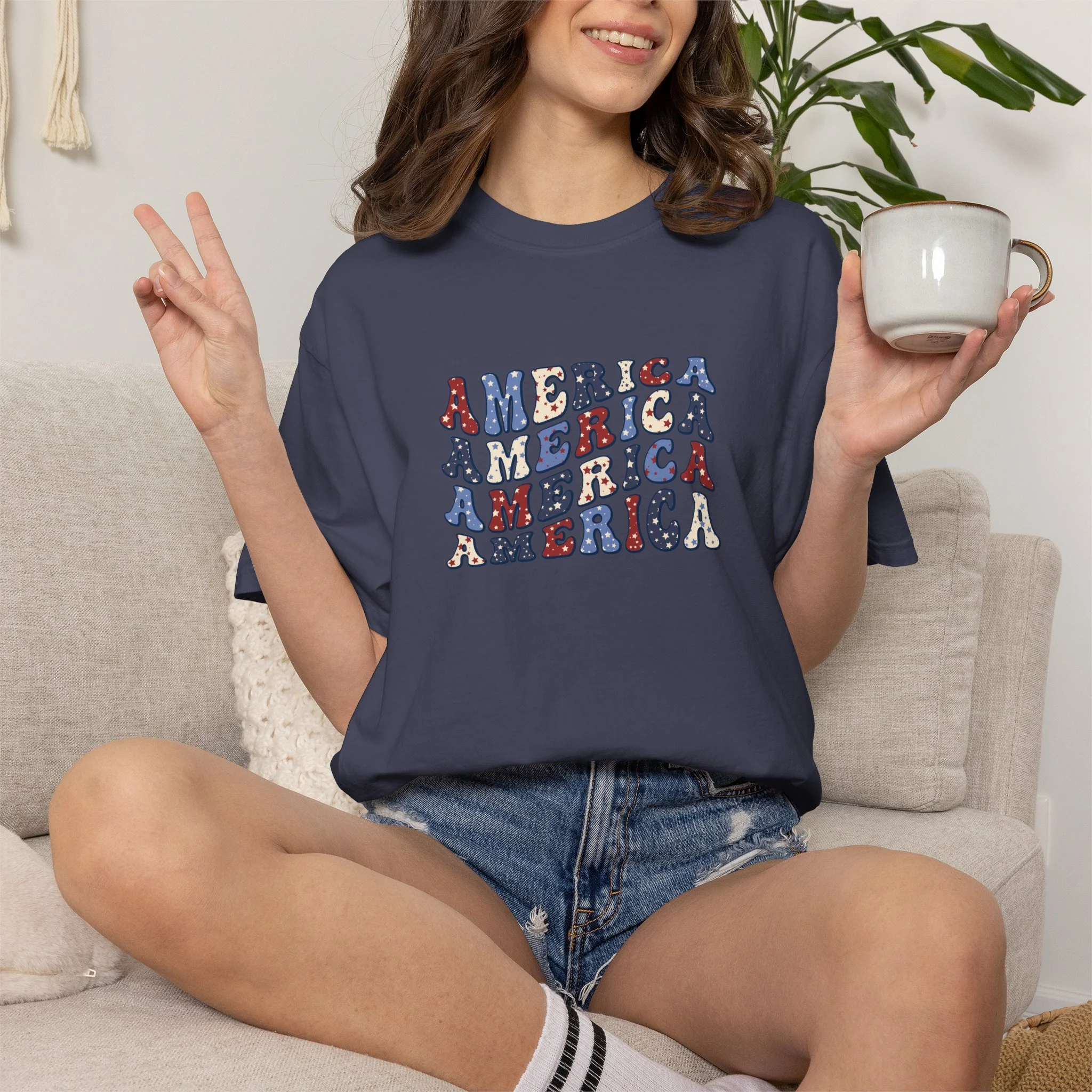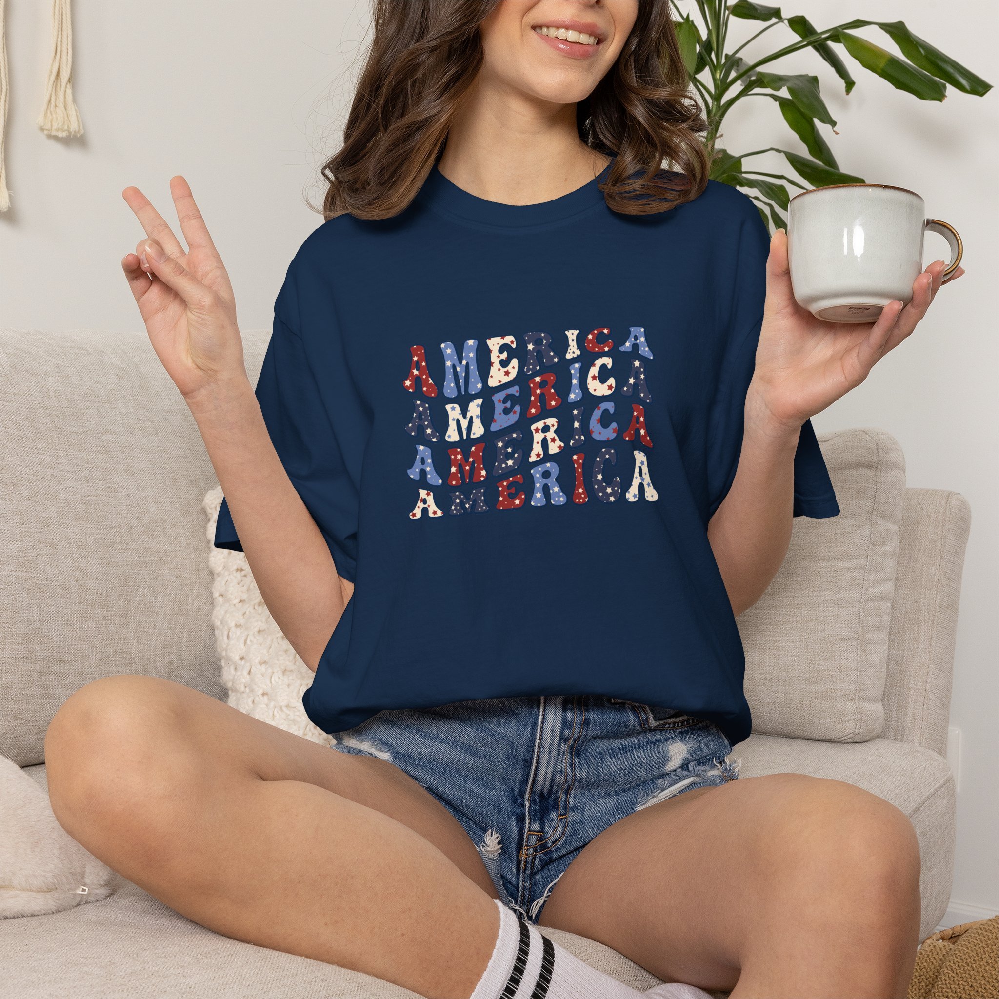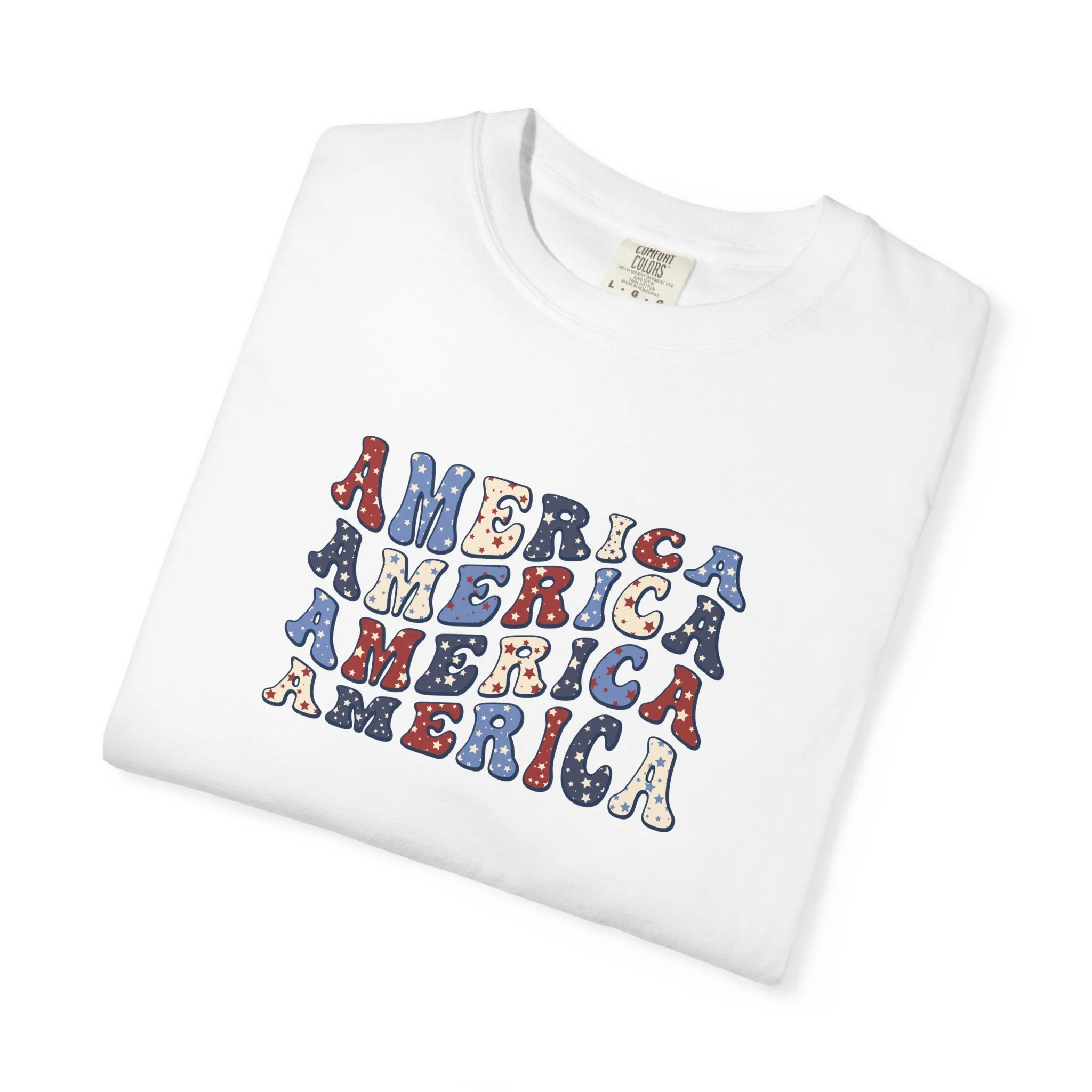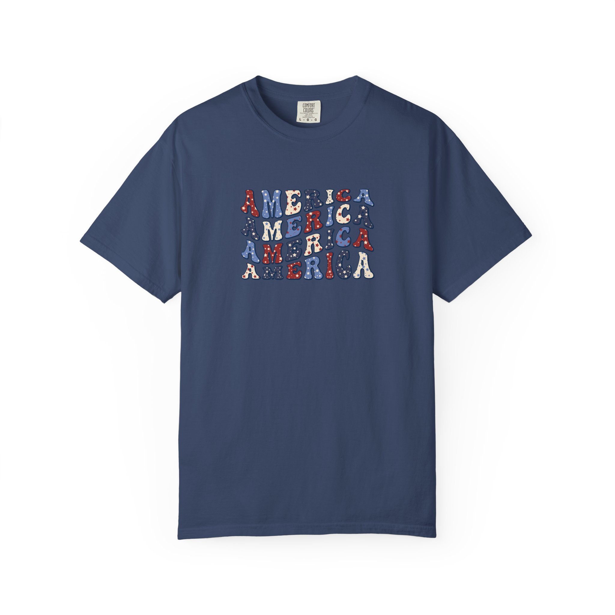 Soft, worn-in cotton with a quiet, nostalgic pulse. This garment-dyed tee brings a relaxed, lived-in feel to days spent around block parties, backyard barbecues, or wandering city streets. The stacked, hand-lettered AMERICA artwork sits centered on the chest in a playful, Americana palette — faded reds and blues that read like summer memories. It drapes with a roomy, relaxed fit and the heavyweight knit settles comfortably on the shoulders. Put it on and you get that easy confidence that comes from something made to last and meant to move with you.